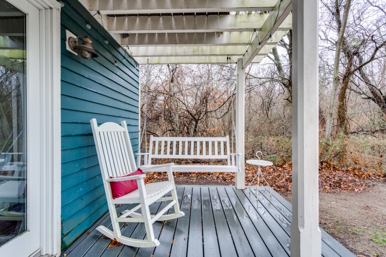 The yard has four Adirondack chairs and a Weber grill. Porches offer seating and a porch swing, and there is an old-fashioned tire swing, too!