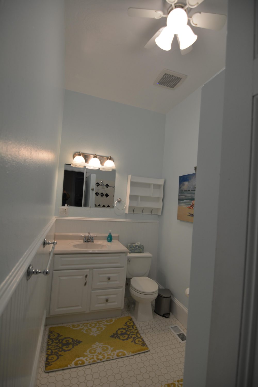 Our open floor plan kitchen space is updated in every way. We also renovated an upstairs bath (added tile and a large shower with glass surround) and added a new powder room on the first floor for a total of 5 showers (3 inside and 2 outside), a bathtub, and 5 toilets.
